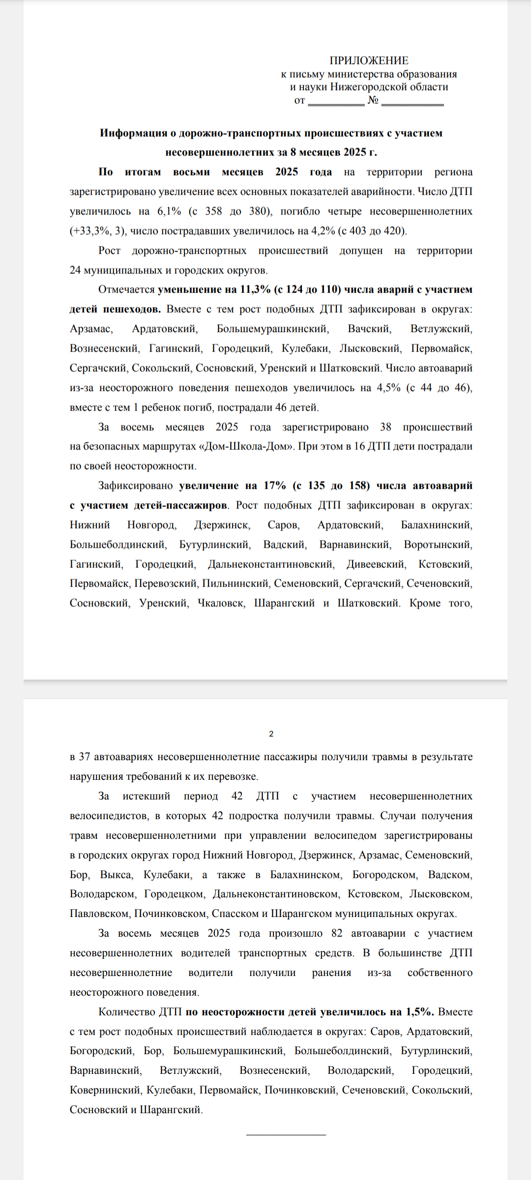 За девять месяцев 2025 года произошло 102 автоаварии с участием несовершеннолетних водителей транспортных средств. В большинстве ДТП несовершеннолетние водители получили ранения из-за собственного неосторожного поведения. 2 Количество ДТП по неосторожности детей снизилось на 3,7%. Вместе с тем рост подобных происшествий наблюдается в округах: Дзержинск, Саров, Ардатовский, Богородский, Большемурашкинский, Большеболдинский, Бутурлинский, Ветлужский, Вознесенский, Володарский, Городецкий, Ковернинский, Кулебаки, Первомайск, Починковский, Сеченовский, Сокольский, Сосновский и Шарангский.
